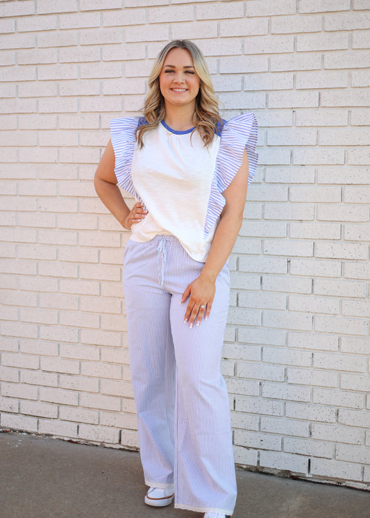 Sold outNAVY STRIPE BLOUSE W/RUFFLE