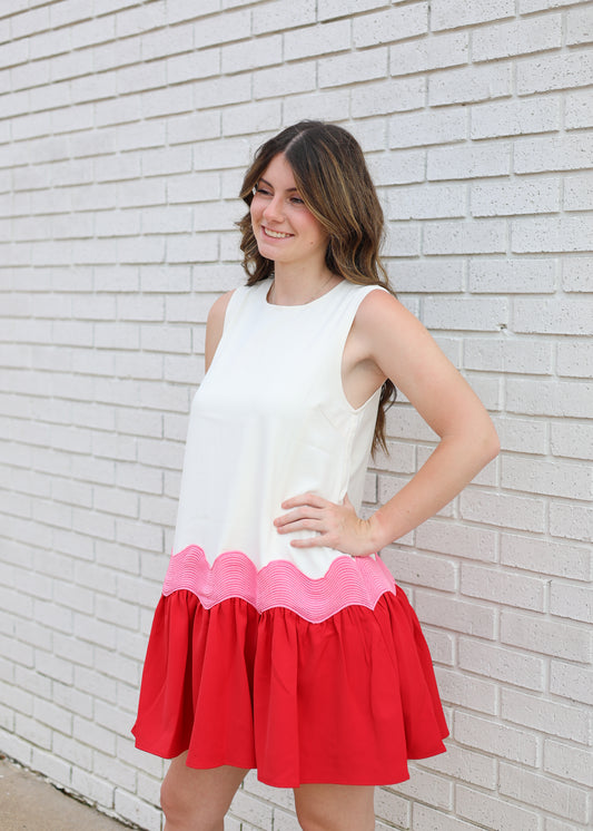 CREAM/PINK/RED COLORBLOCK DRESS W/OVERSIZED RIC RAC TRIM