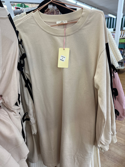 TAUPE SWEATSHIRT DRESS W/BLK VELVET RIBBON TRIM