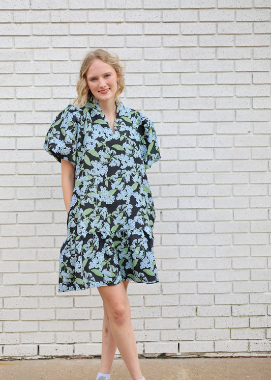 BLACK & WHITE FLORAL PRINT BUBBLE SLEEVE MINI DRESS