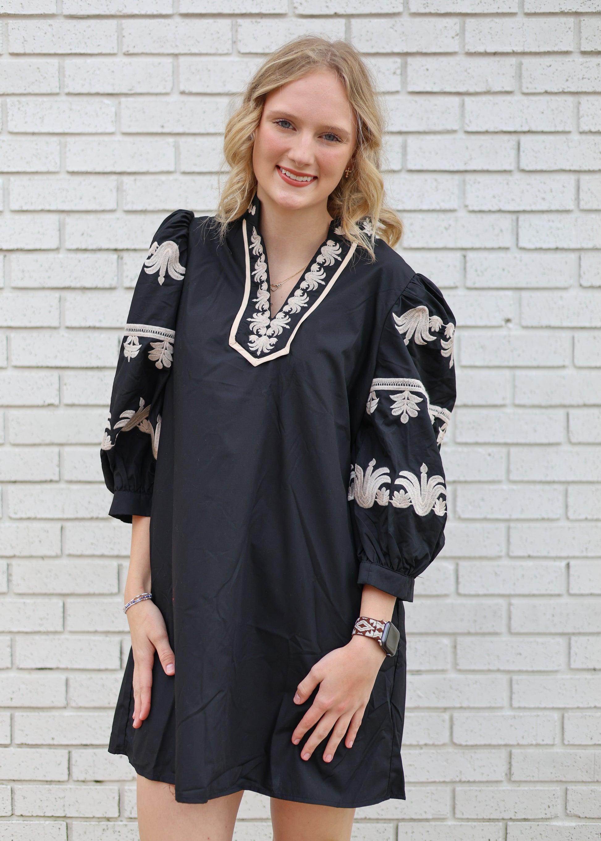 Solid 3/4 puff sleeve mini dress with gathered sleeve openings featuring contrast embroidery along split neckline, collar and sleeves. Side pockets. Lined. Woven. Non-sheer. Lightweight.
