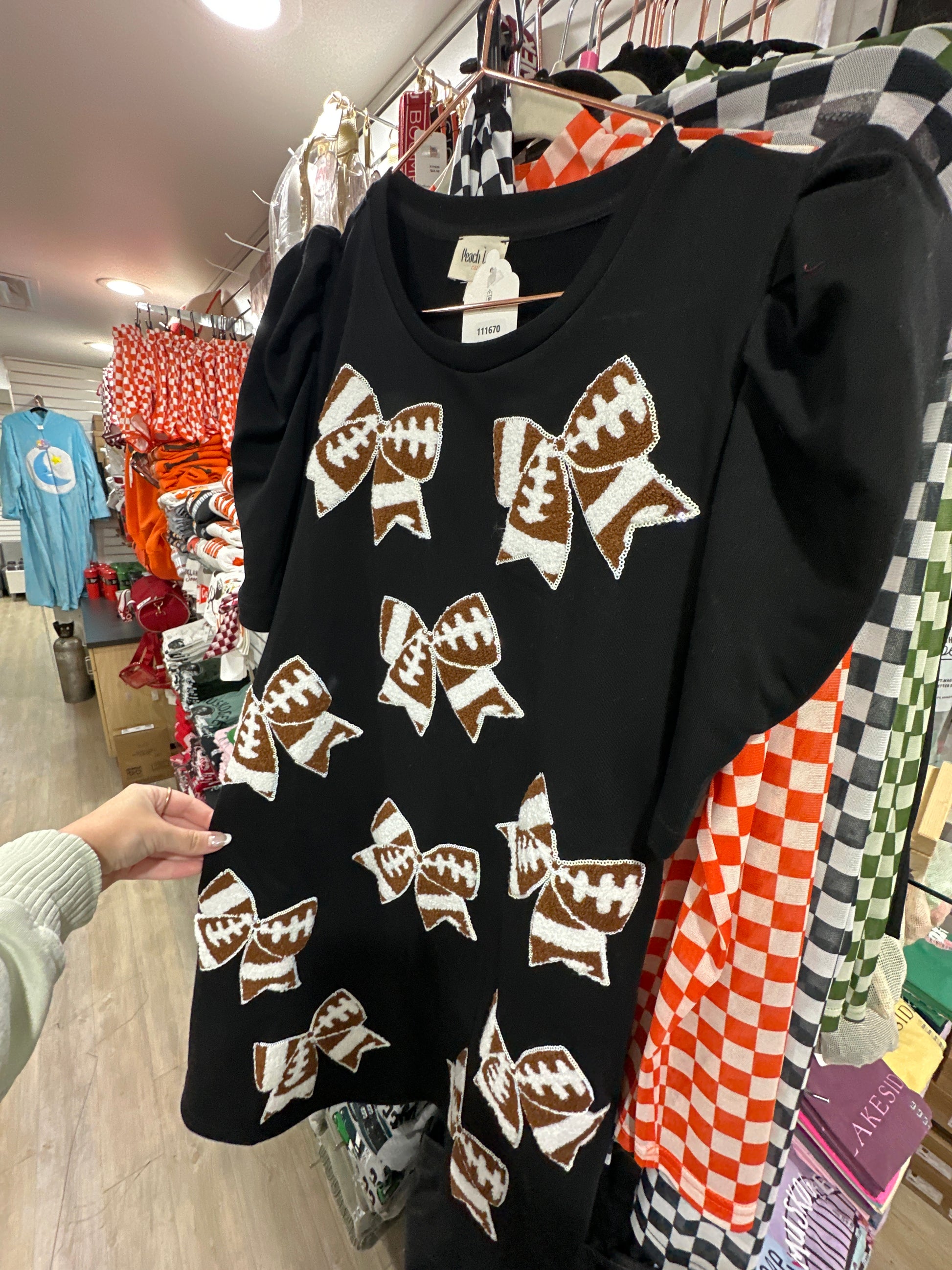 BLACK PUFF SLEEVE DRESS W/FOOTBALL BOW - L