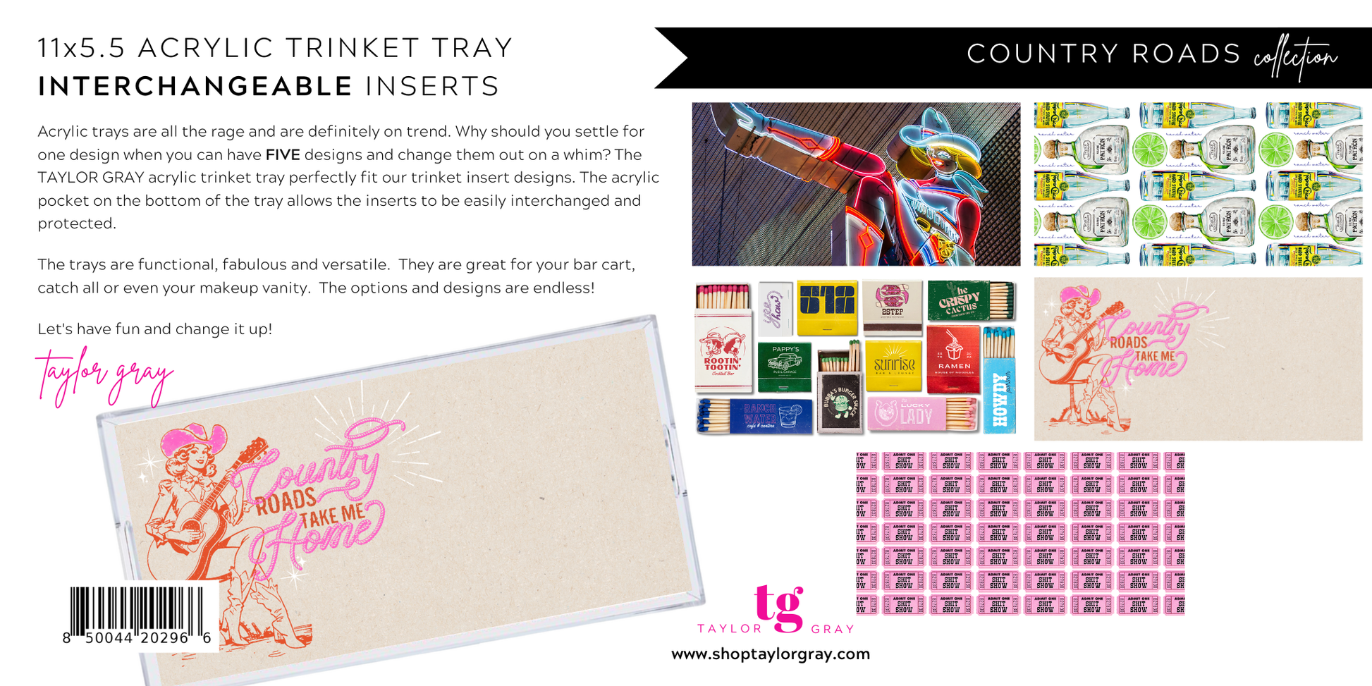 **The TAYLOR GRAY acrylic TRINKET TRAY is a 11x5.5 tray that perfectly fit our TRINKET insert designs. The patent pending pocket on the bottom of the tray allows the inserts to be easily interchanged and protected. Acrylic trays are all the rage and are definitely on trend. Why should you settle for one design when you can have FIVE designs and change them out on a whim?