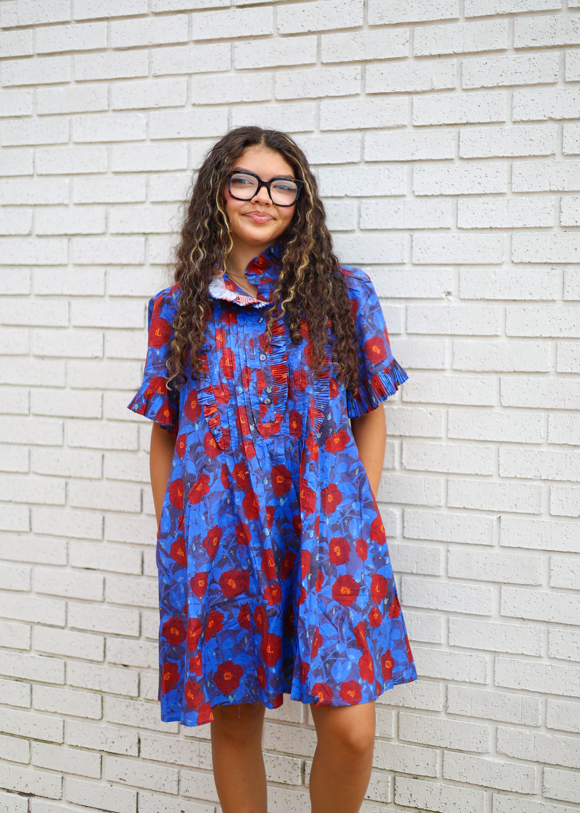Floral print short sleeve pintuck mini dress featuring pleat-accent ruffle details. Pockets at sides. Lined. Woven. Non-sheer. Lightweight.