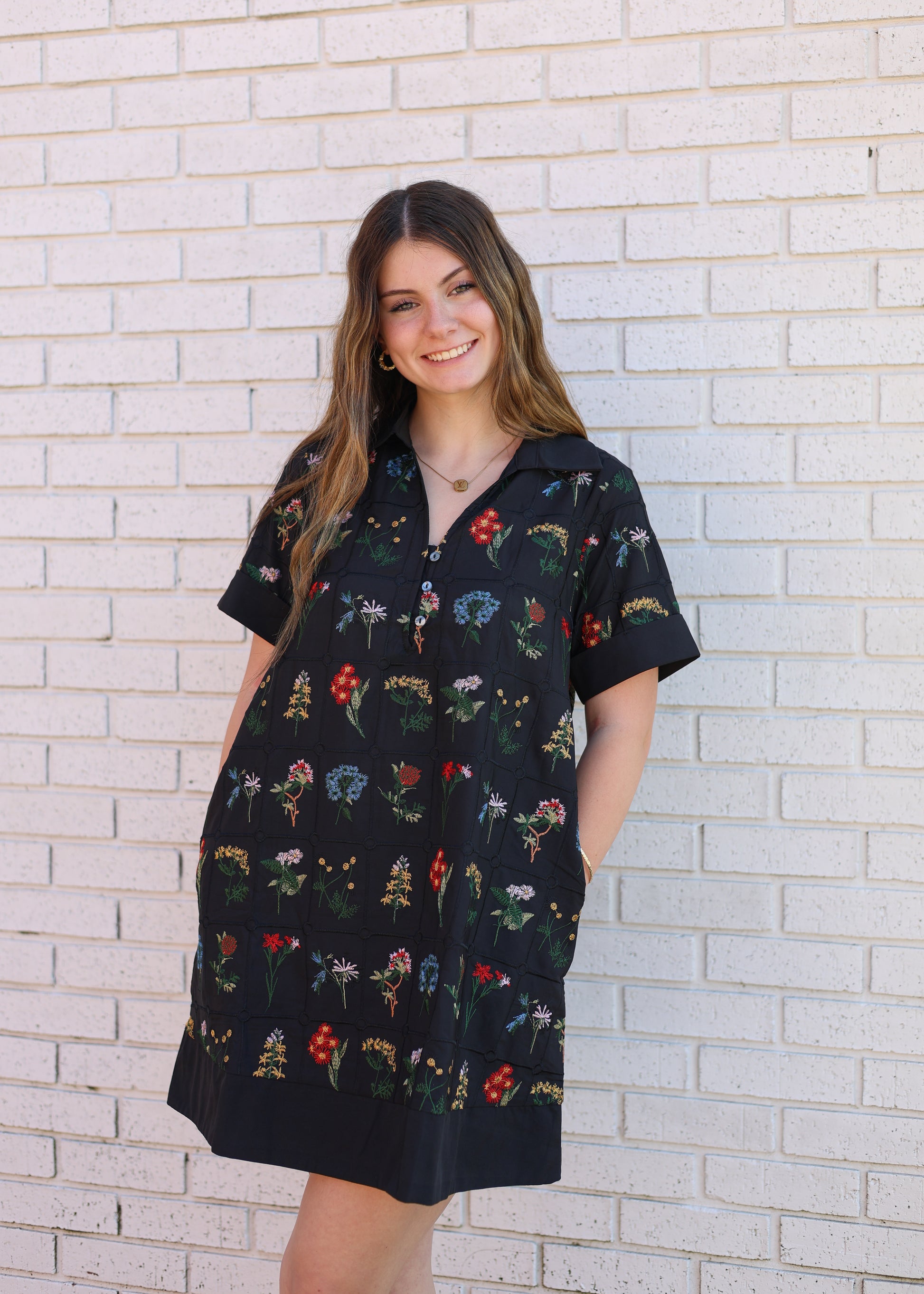 BLACK FLORAL EMBROIDERED MINI DRESS