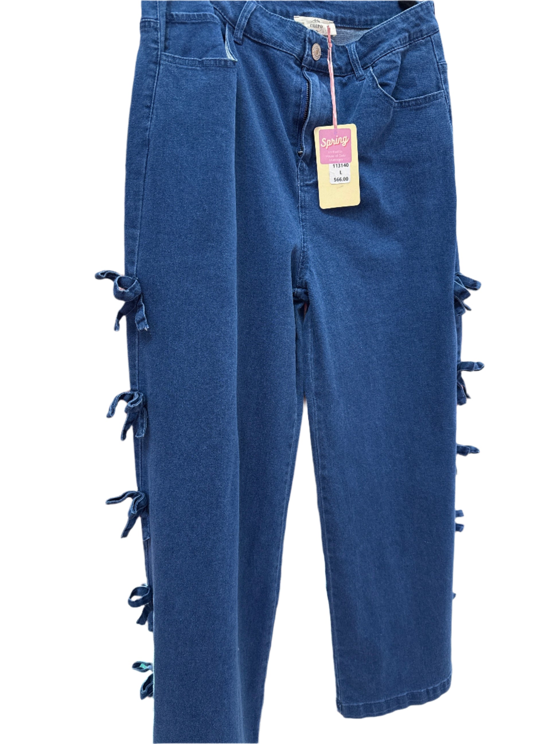 Unleash your fashionista side with our stylish denim jeans! These trendy jeans feature unique ties down the side seam, elevating your outfit with a playful twist. Crafted from high-quality denim, they offer both comfort and style, making them a versatile addition to any wardrobe. Perfect for dressing up or down, these jeans are designed to make a statement while ensuring you feel confident and chic.