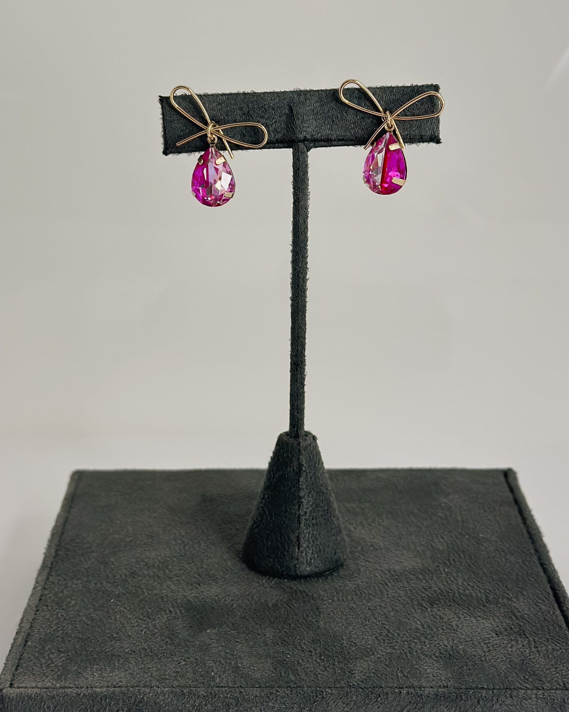 Delicate gold wire bows frame soft pink teardrop gems in these charming earrings that bring a touch of whimsy to any look. Perfect for adding a pop of color and personality to your everyday style or special occasion ensemble.