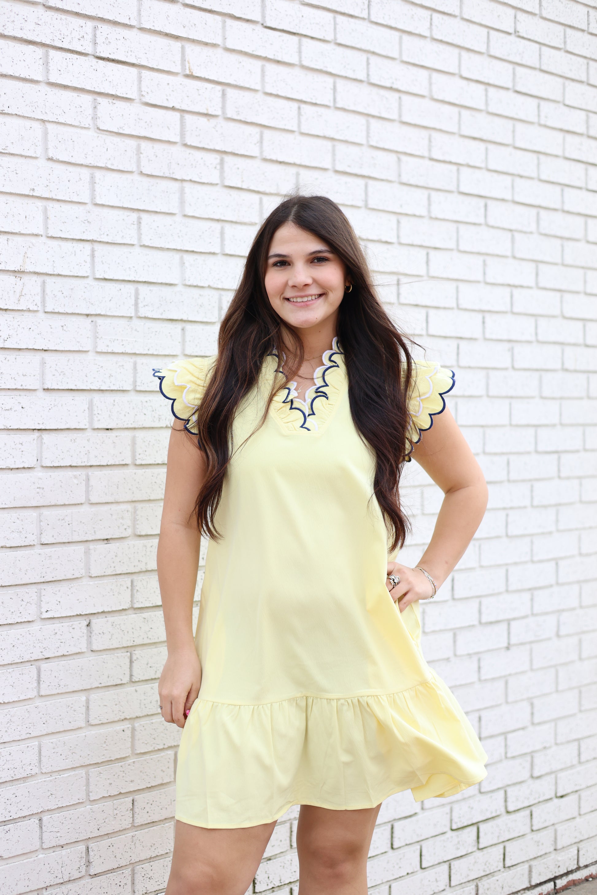 A cheerful solid dress that twirls with personality—featuring delightfully layered ruffle cap sleeves trimmed with an embroidered scallop edge. Practical side pockets make it as functional as it is fun. Perfect for adding a splash of butter yellow brightness to any occasion.