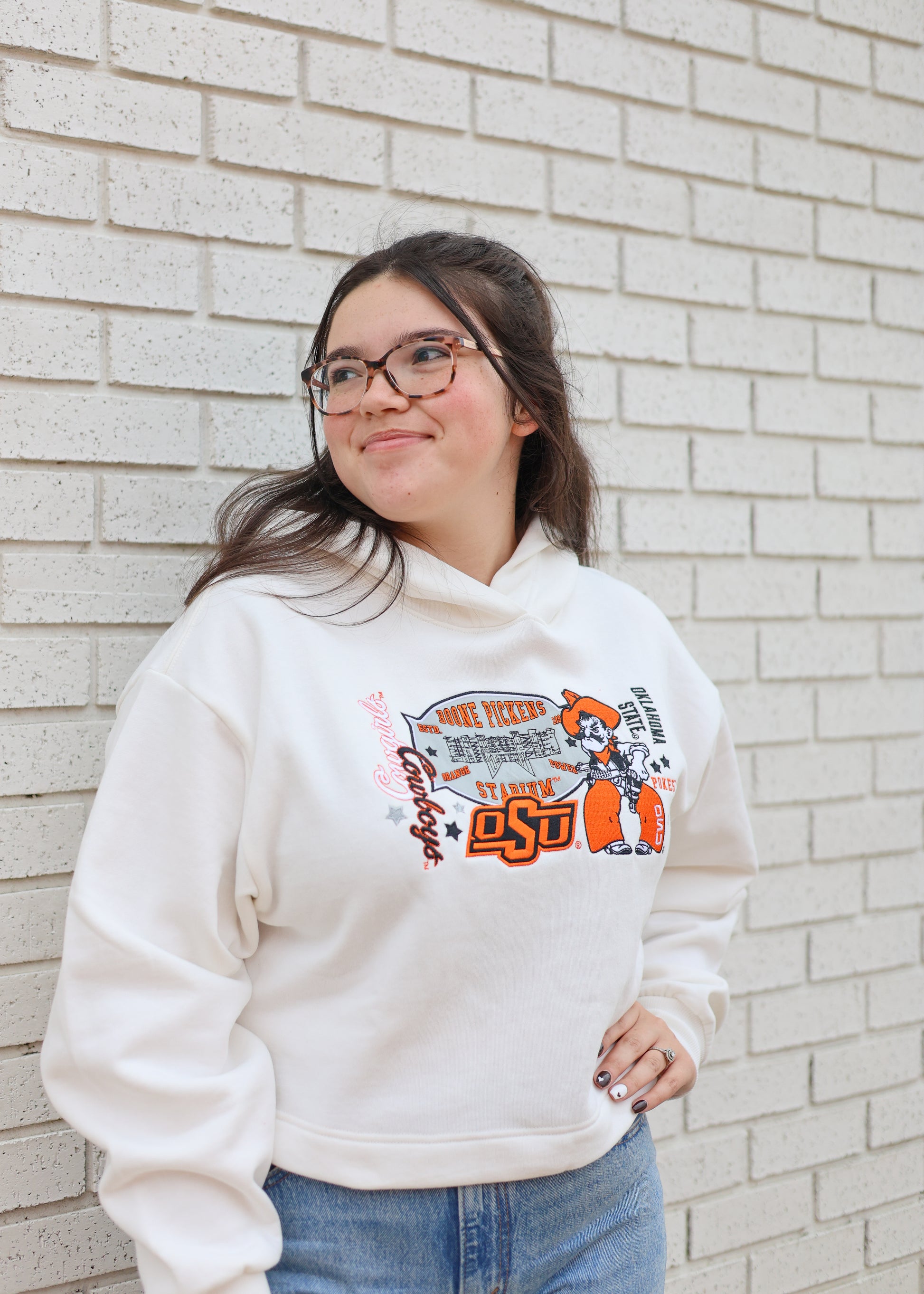 Stay stylish and cozy in the OK State Layer Patch Luxe Crop Hoodie! This playful hoodie features bold patch details that add a fun twist to your casual look. Its cropped fit keeps things fresh and flirty, perfect for layering or rocking solo. Soft and comfy, it’s your new go-to for game day or chill days alike.