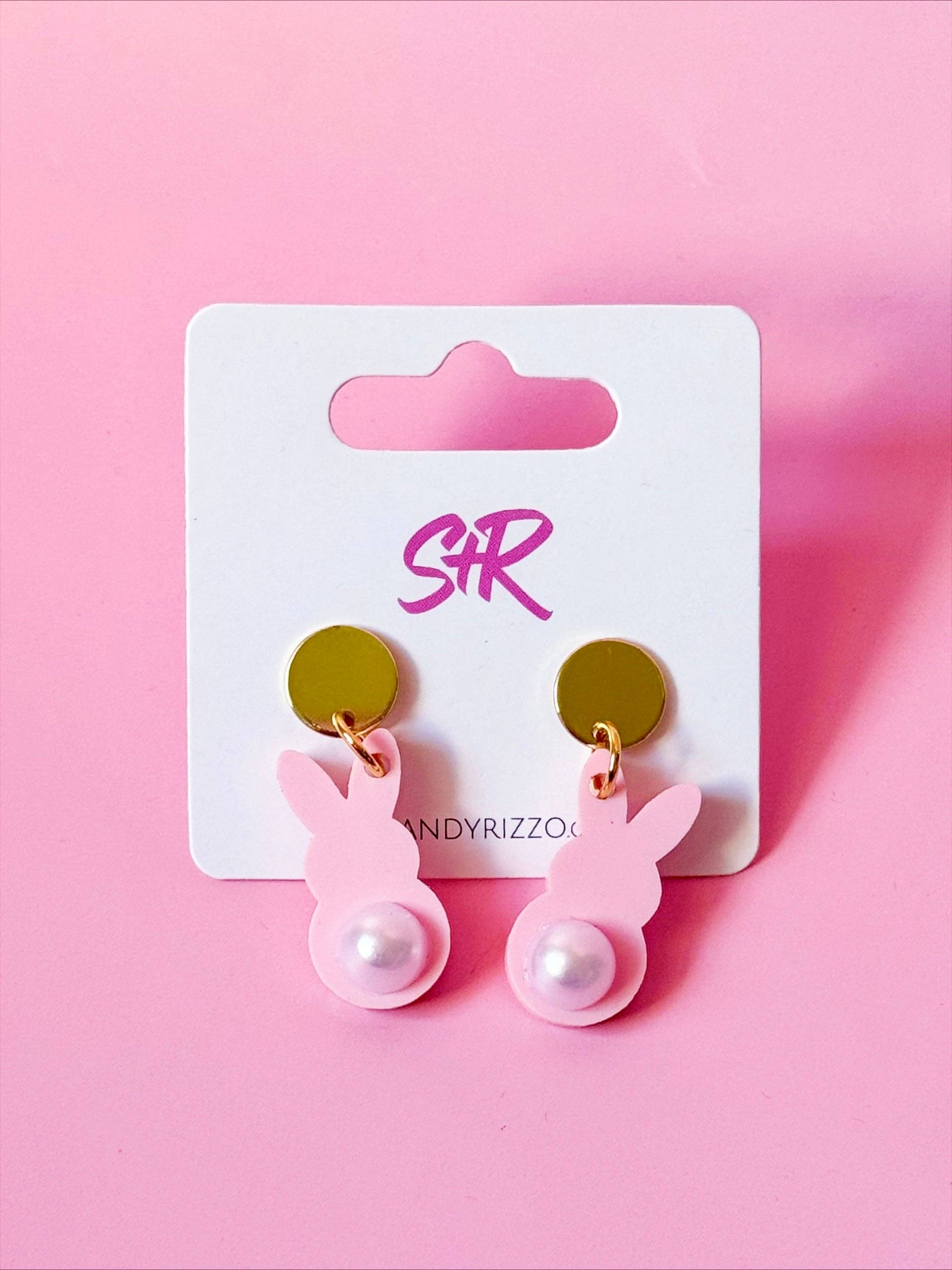 Matte pink bunny dangle with a white pearl tail and a shiny gold top. An adorable Easter or Spring earring for you or your mini me!