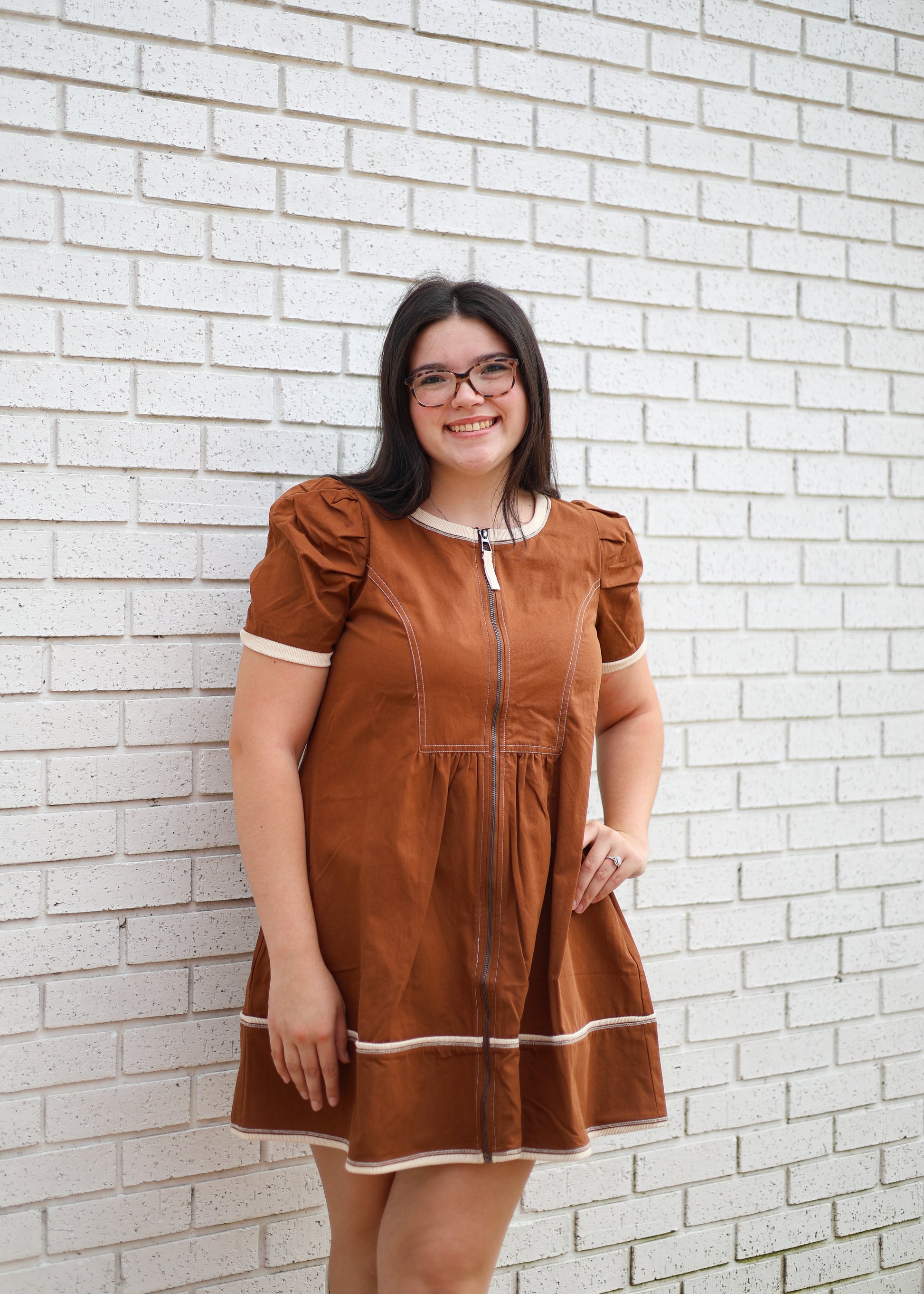 CHESTNUT FRONT ZIPPER MINI DRESS WITH CONTRAST BAND ACCENT TRIM