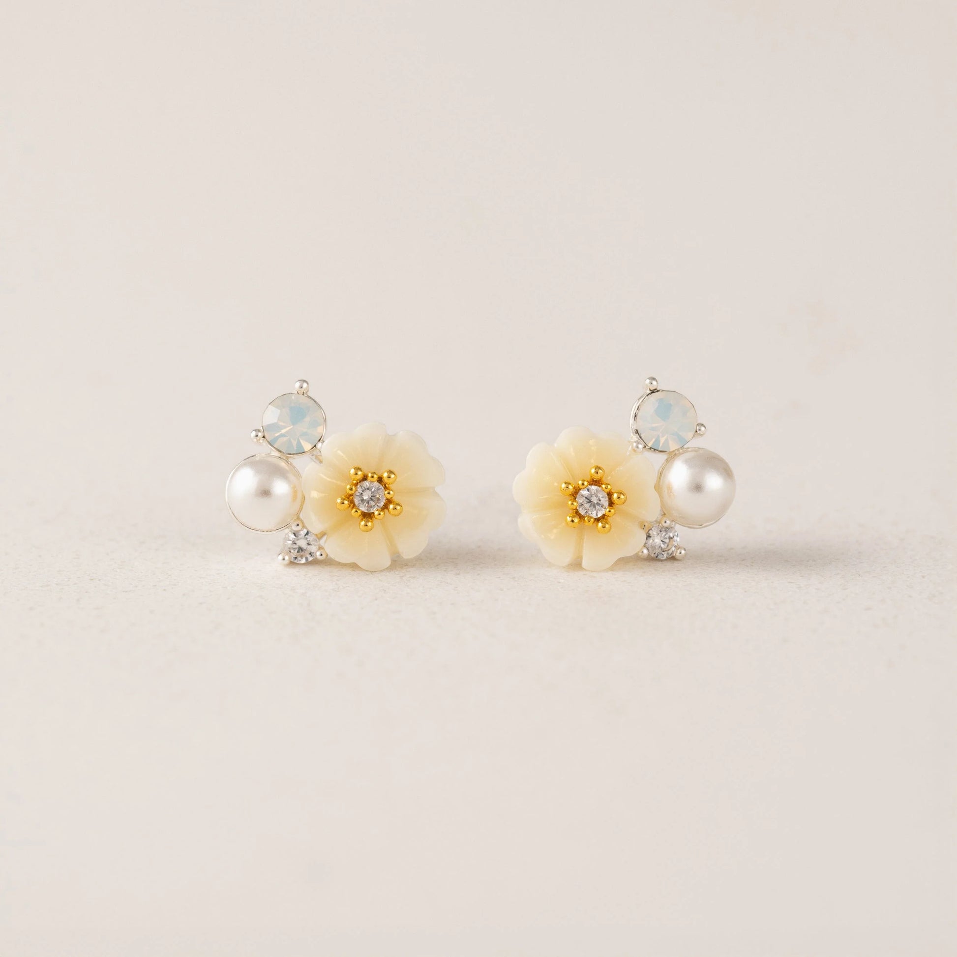 Pearl, crystal and delicate stone petals are meticulously crafted into a graceful stud; a perfect complement to your sweet face.