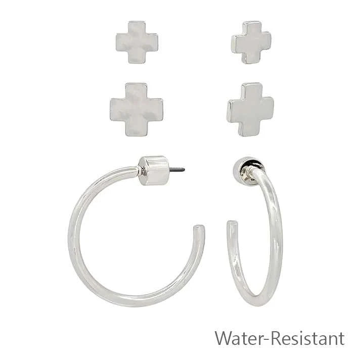 Water Resistant Set of 3 Silver Cross and Hoop Earrings